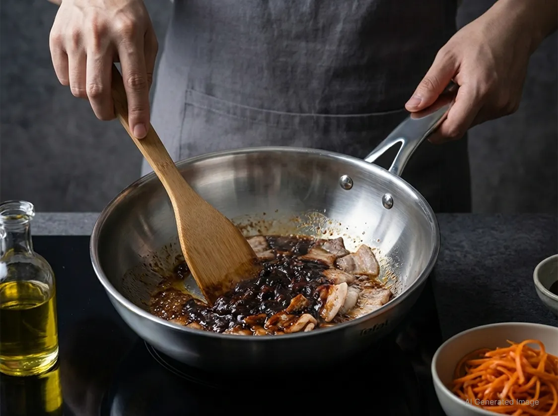 요리 경연 프로그램을 보면 셰프들이 스테인리스 스틸 팬을 사용하는 장면을 자주 볼 수 있습니다. 스테인리스 스틸은 재료의 수분과 온도 변화를 즉각적으로 느낄 수 있어, 불 조절과 익힘 타이밍을 섬세하게 잡기 좋기 때문입니다. 덕분에 기름에 춘장과 된장을 볶는 과정에서도, 타지 않으면서 재료의 풍미를 깊게 끌어내는 데 도움을 줍니다. 특히 테팔 인덕션 스테인리스 스틸 퍼펙트 레지스트 프라이팬은 인덕션 사용에 최적화된 테팔의 특수 3중 인덕션 바닥 설계로, 열이 고르게 전달되어 보다 안정적인 조리가 가능합니다.