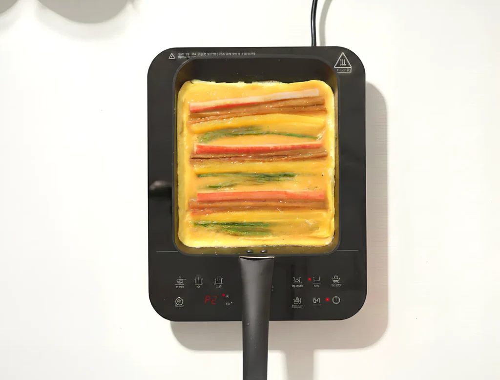 테팔 인덕션 티타늄 계란말이팬의 사각 구조를 활용하면, 꼬치 없이도 가지런한 산적을 만들 수 있습니다. 테팔 인덕션 티타늄 계란말이팬에 재료를 나란히 놓고, 계란물을 넉넉히 부어주세요. 정갈한 모양은 그대로 살리면서 준비 과정은 훨씬 간단해집니다.