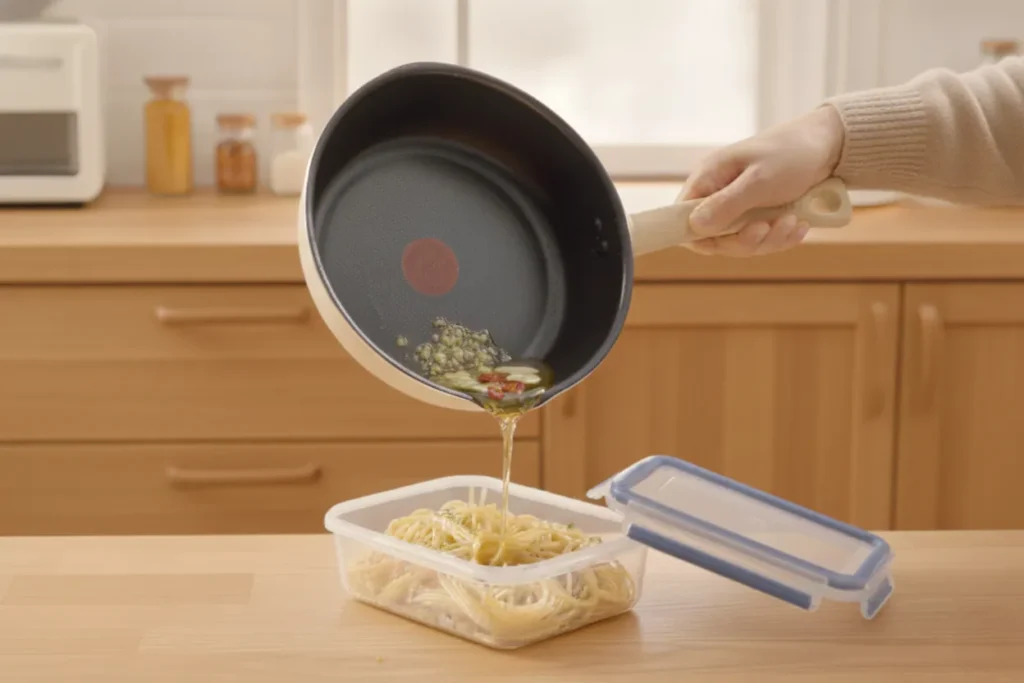 생각보다 보관이 까다로운 재료 중 하나가 마늘입니다. 한 봉지씩 구매하게 되는 만큼, 신선할 때 활용하는 것이 중요합니다. 알리오 올리오는 재료가 단순하면서도 밀프렙으로 활용도가 높습니다. 테팔 원픽냄비팬 플러스에 파스타면을 삶고, 면수는 2~3국자 덜어 따로 보관합니다. 삶은 면은 물기를 빼 올리브오일로 가볍게 버무려둡니다.