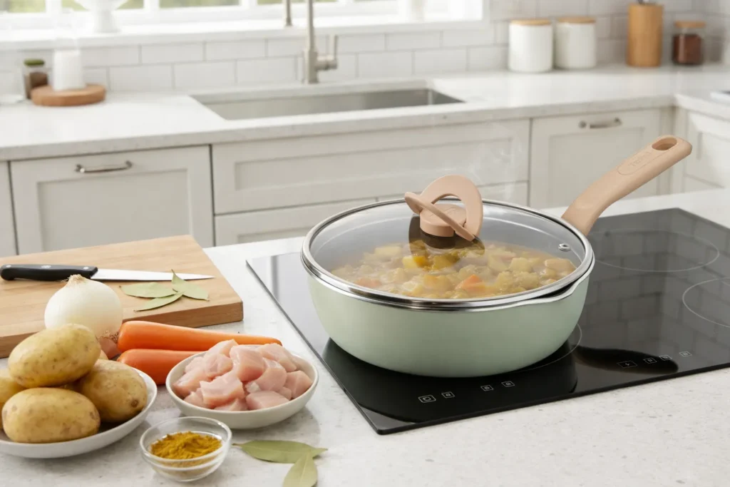 냉장고 속 채소를 한 번에 정리하고 싶다면 카레만 한 메뉴가 없습니다. 대부분의 채소를 활용할 수 있고, 만들어두면 간편하게 즐기기에도 적합하죠. 카레의 깊은 맛을 좌우하는 재료는 양파입니다. 테팔 원픽냄비팬 플러스에 식용유를 두르고 채 썬 양파 2개 분량을 넣어 갈색이 될 때까지 천천히 볶아 캐러멜화합니다. 여기에 감자와 당근처럼 단단한 채소부터 넣어 함께 볶은 뒤 물을 붓고, 뚜껑을 덮어 그대로 끓여줍니다. 볶음과 끓이기를 하나의 팬에서 이어갈 수 있어 조리 흐름이 끊기지 않고, 재료의 맛도 더 잘 어우러집니다. 조리가 끝난 뒤에는 손잡이를 접어 높이를 낮출 수 있어 세척이나 보관도 한결 간편합니다.
