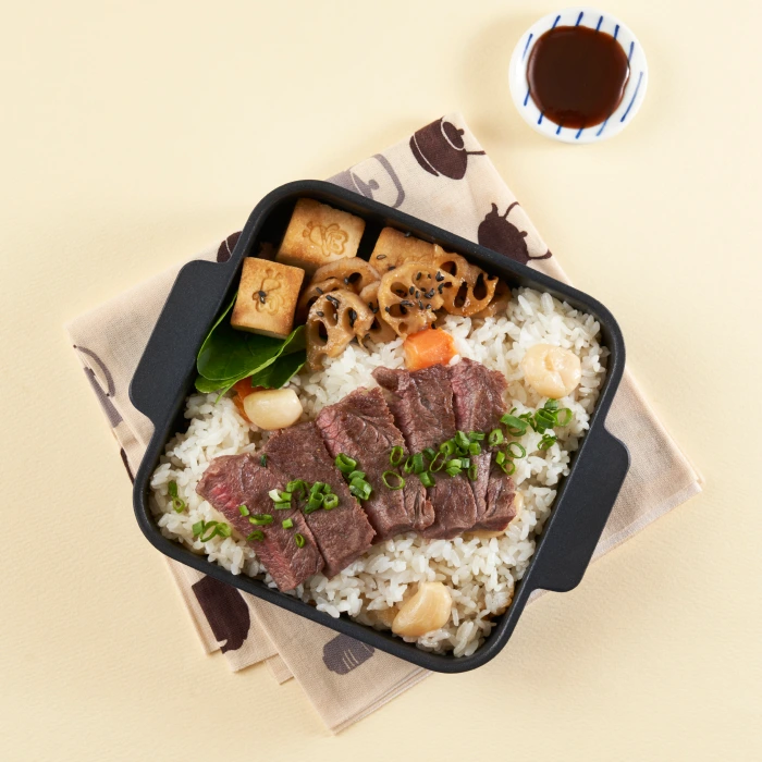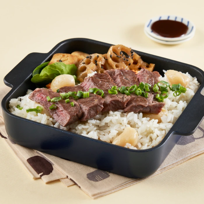 *스테이크는 오래 익히지 않는다. - 쇠고기를 잘라서 솥밥의 뜸을 들일 때 넣어 2-3분간 익혀준다.