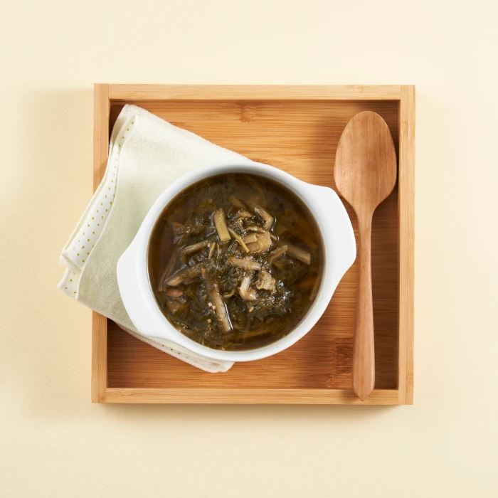 *기호에 따라 시래기 대신, 시금치, 배추, 봄동, 냉이 등의 재료를 활용한다. - 내솥에 시래기, 동전육수, 대파, 물을 넣는다.