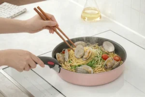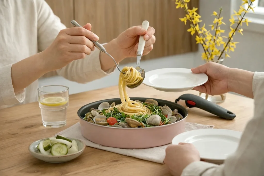냉이의 매력에 된장의 깊은 감칠맛과 조개 육수의 시원함을 더해 완성한 냉이 된장 봉골레 파스타. 분홍빛 감성이 가득한 테팔 매직핸즈 크렘 드 피치와 함께, 올봄 식탁에 새로운 변화를 더해보세요.