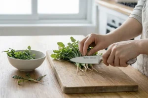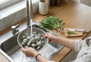 4. 마지막으로 찬물에 약 10분 정도 담가 이물질을 충분히 불린 뒤 깨끗하게 헹궈줍니다. 이때 향을 살리기 위해 너무 오래 담가두지 않는 것이 중요합니다.