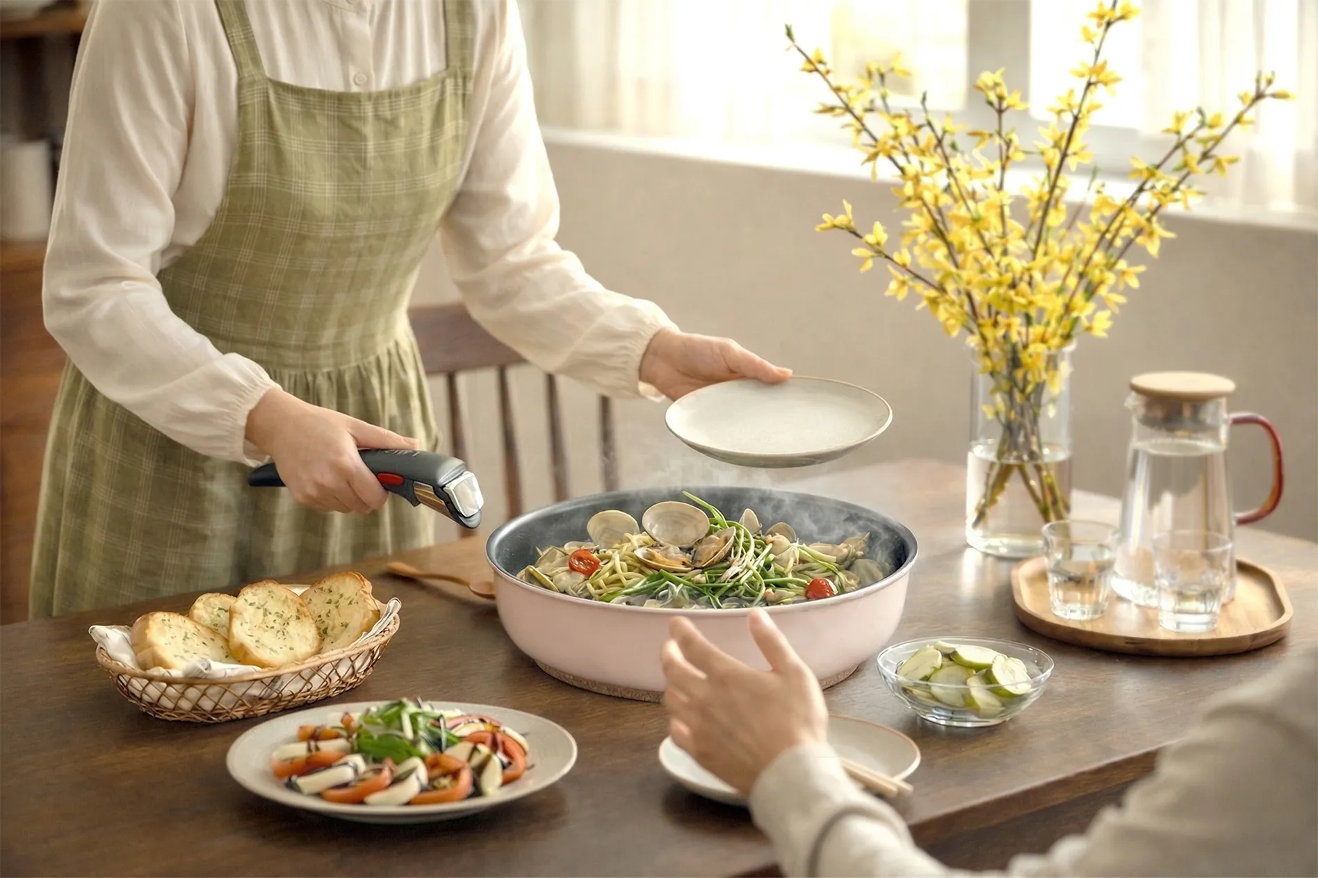 향긋한 봄나물 요리는 맛뿐만 아니라 분위기까지 함께 완성되는 순간 더욱 특별해집니다. 테팔 매직핸즈 크렘 드 피치의 부드러운 분홍빛 컬러는 봄의 감성을 자연스럽게 담아내어 식탁 위 플레이팅까지 한층 화사하게 밝혀주는데요.