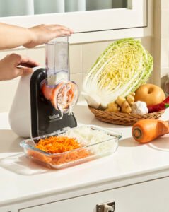 2. 갓과 쪽파는 4cm 길이로 썰고, 무채와 당근은 테팔 프레시 익스프레스의 둥근 채칼로 편하게 썰어주세요.