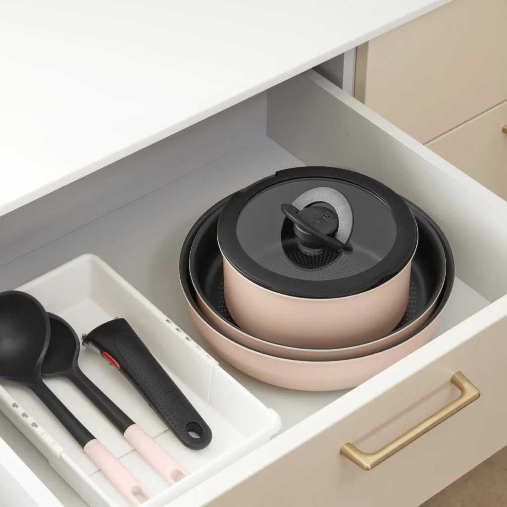 손잡이가 분리되는 구조 덕분에 프라이팬과 냄비를 포개어 수납할 수 있어 공간 활용이 한결 수월합니다. 손잡이 이음새가 없어 설거지할 때 음식물이 끼일 걱정이 적고, 식기세척기 사용도 가능해 관리 부담을 덜어줍니다.