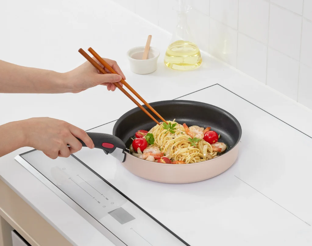테팔 매직핸즈의 손잡이는 한 손으로도 손쉽게 탈부착이 가능해, 여러 팬을 번갈아 사용할 때도 번거로움이 없습니다. 조리 중에는 안정적으로 사용할 수 있고, 완성 후에는 손잡이를 분리해 그릇처럼 플레이팅 할 수 있어 테이블 연출에 잘 어울립니다.